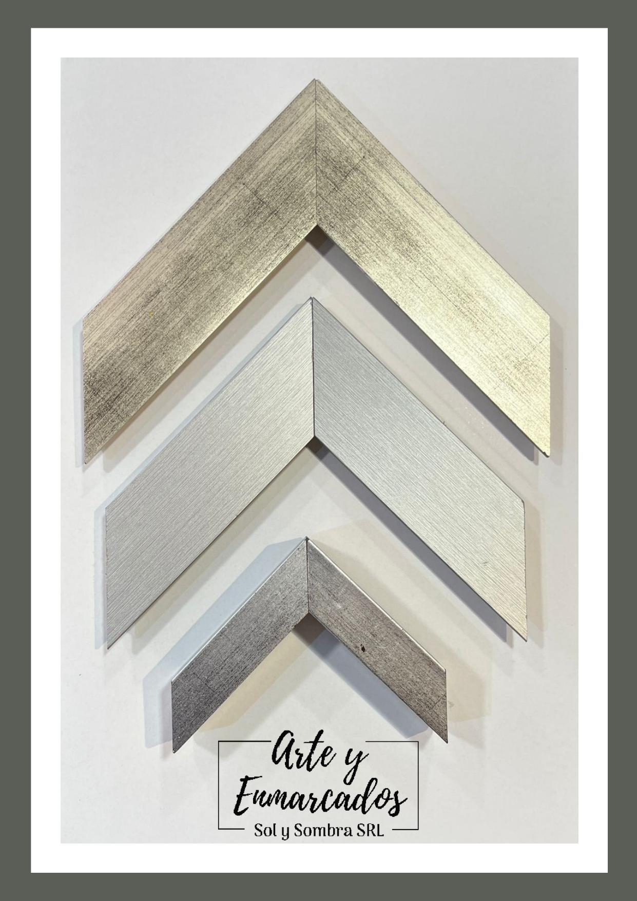 Molduras en tono plata cepillada, sobrias y modernas para enmarcados elegantes.