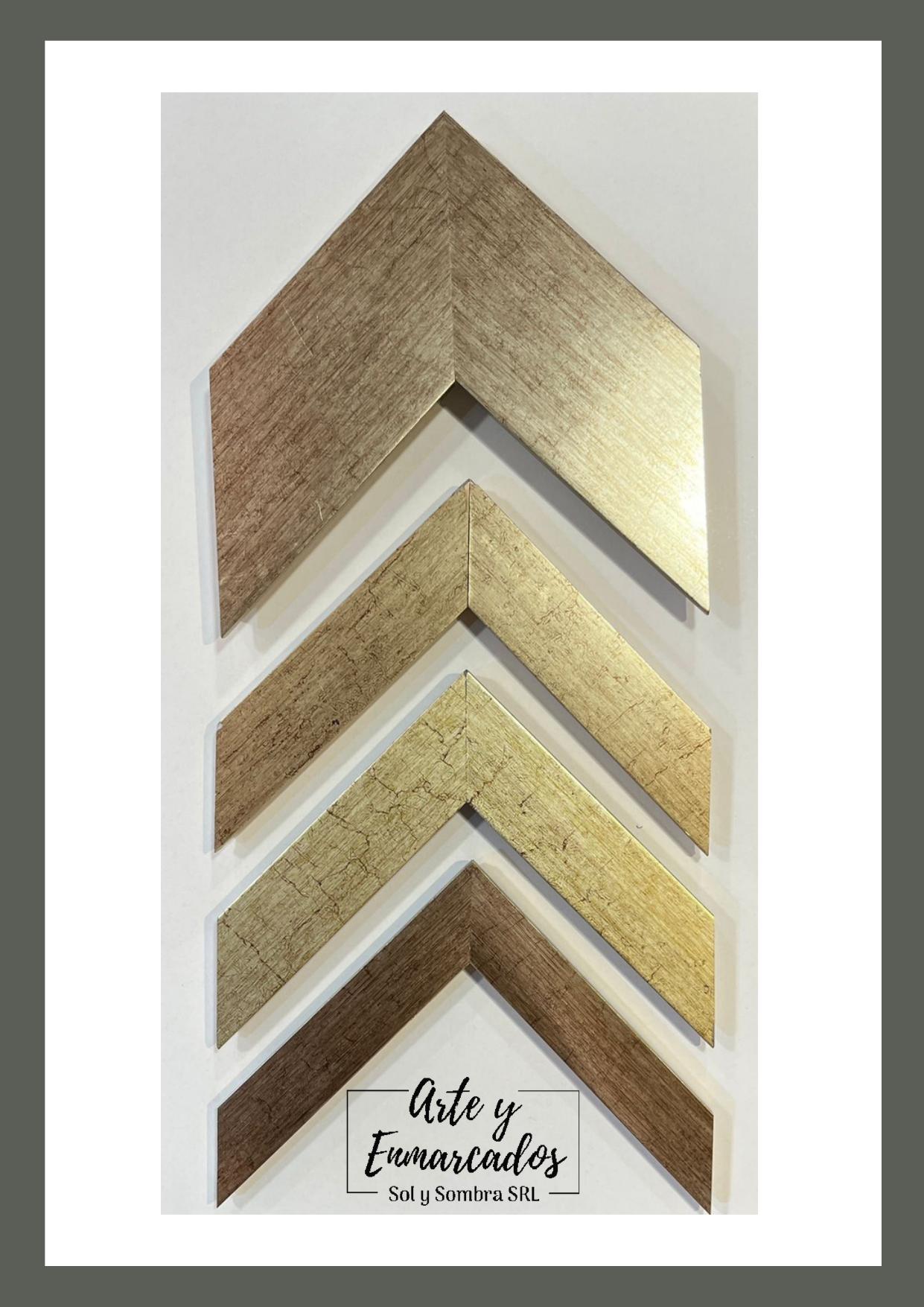 Molduras doradas envejecidas con textura artesanal y perfil plano.