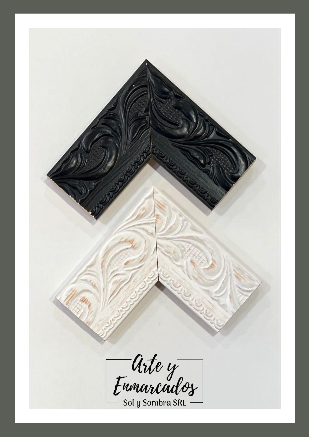 Molduras de estilo tallado artesanal, disponibles en tonos negro satinado y blanco decapado. Presentan relieves de hojas y arabescos que evocan el trabajo clásico del tallado en madera, con terminación envejecida. Su diseño aporta textura y carácter, ideal para marcos decorativos con identidad artística. Perfectas para espejos, obras clásicas o composiciones de estilo vintage.