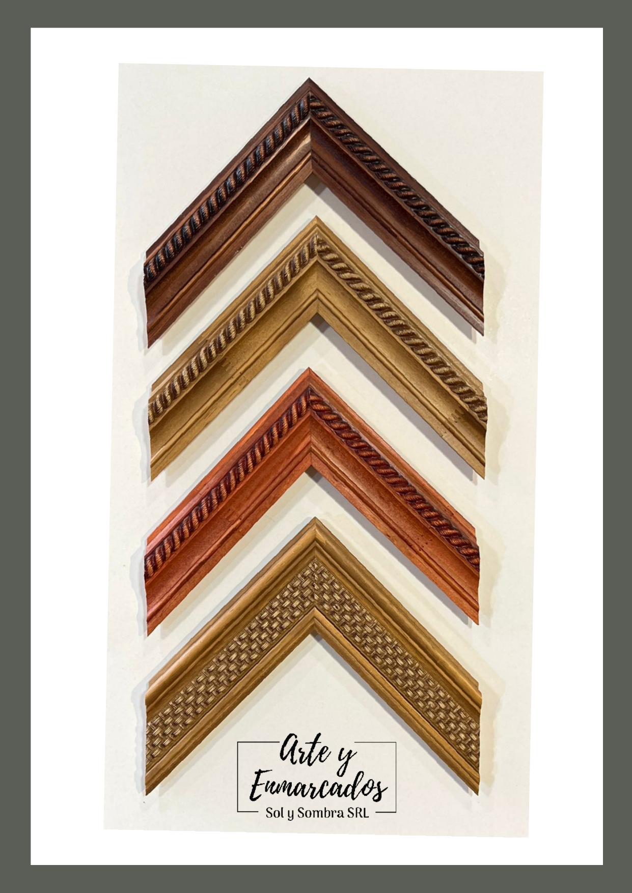 Serie de molduras en madera con detalles tallados en relieve, que combinan texturas trenzadas y acabados en tonos cálidos. Los matices de marrón, dorado y rojizo aportan un estilo tradicional y elegante. Su superficie con relieves decorativos otorga profundidad visual, perfecta para marcos que buscan resaltar obras, espejos o piezas artesanales.
