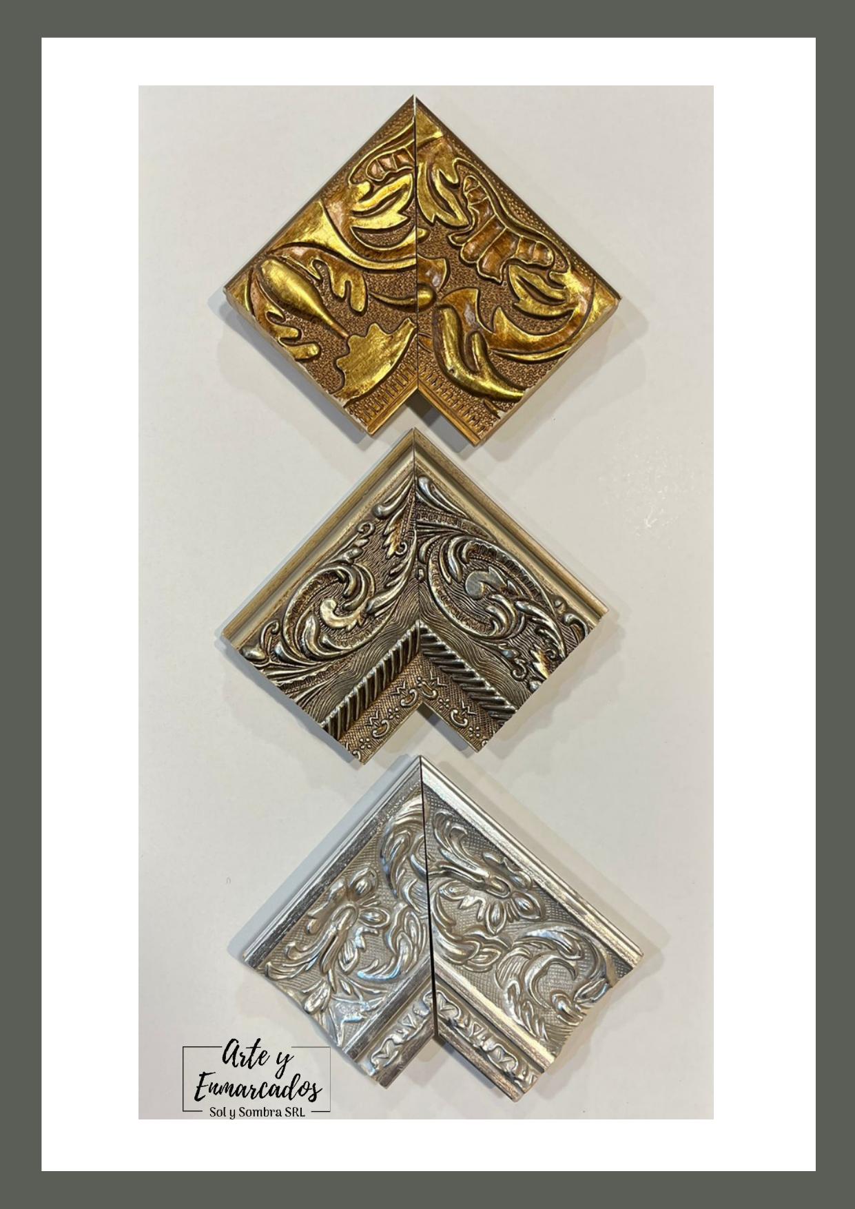 Conjunto de molduras en acabados metálicos dorado, plata y bronce, con relieves de inspiración barroca y ornamental. Su textura tallada y su brillo envejecido evocan elegancia clásica, aportando un toque artístico y majestuoso a cualquier marco o espejo. Ideales para obras de arte o piezas decorativas que buscan impacto visual y distinción.