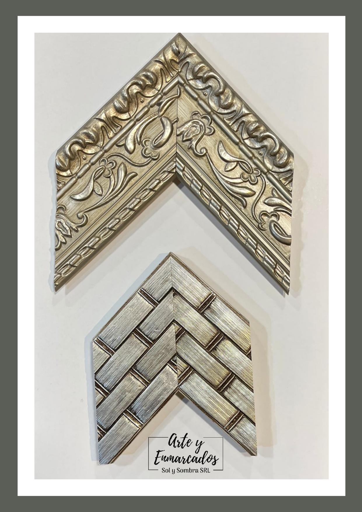 Molduras en acabado plateado satinado, con dos estilos complementarios: una con motivos florales en relieve y otra con textura entrelazada tipo trenzado. Su combinación de brillo y textura aporta un equilibrio entre elegancia y modernidad, ideal para obras, espejos y marcos decorativos que buscan un acabado refinado y luminoso.