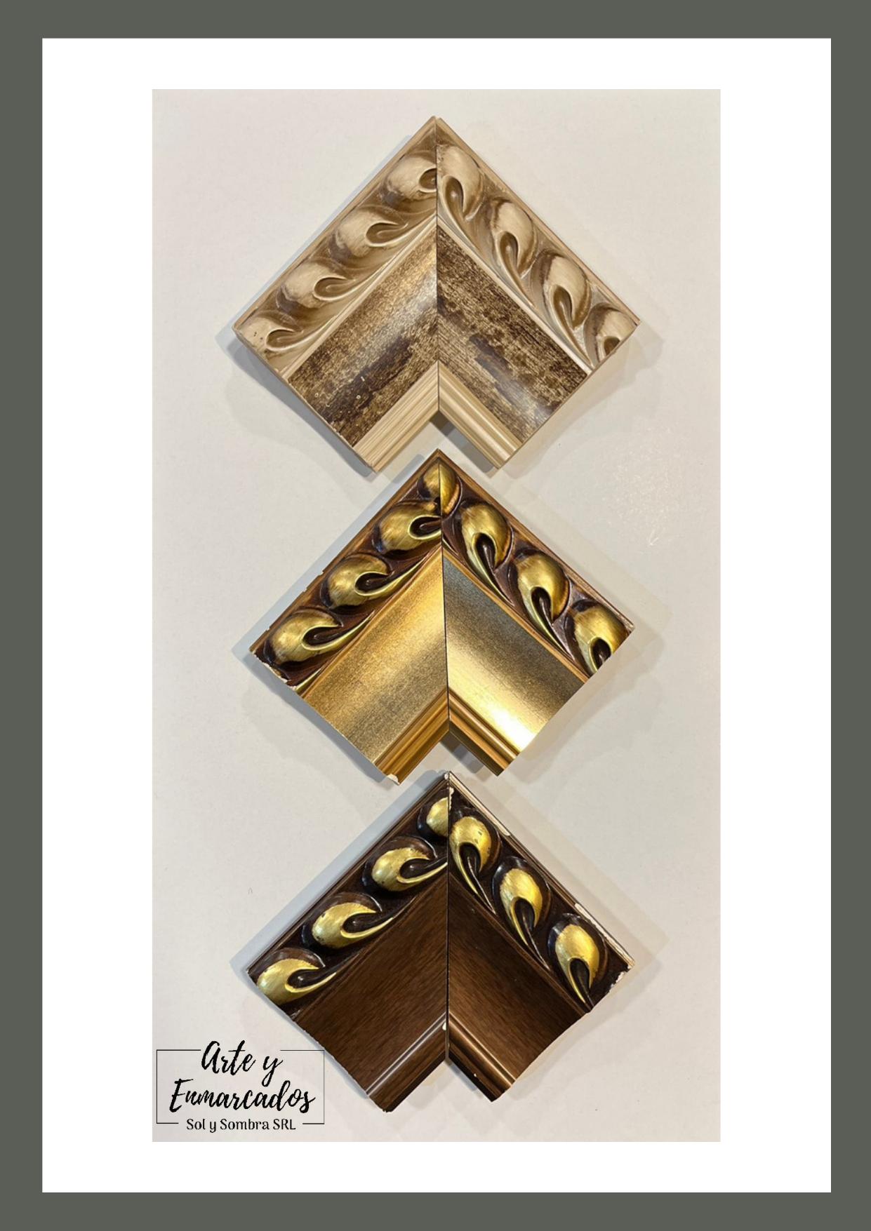 Conjunto de molduras en tonos dorados, beige y marrones, con detalles en relieve ondulado tipo gota que aportan textura y movimiento visual. Su diseño combina el brillo del dorado con la calidez de la madera, creando un equilibrio entre elegancia clásica y sofisticación moderna. Perfectas para enmarcar obras o espejos con un toque artístico y decorativo.